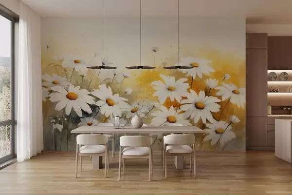 murais de parede Um campo de margaridas brancas com centros amarelos, em um fundo amarelo e bege suave, em estilo aquarela  w09218