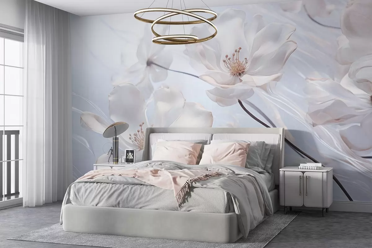 Murais de parede Flores brancas transparentes texturizadas com pétalas delicadas, fundo azul claro suave, elegante, romântico, sonhador Nr. w09233