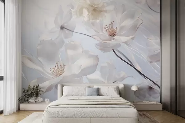 Murais de parede Flores brancas transparentes texturizadas com pétalas delicadas, fundo azul claro suave, elegante, romântico, sonhador Nr. w09233