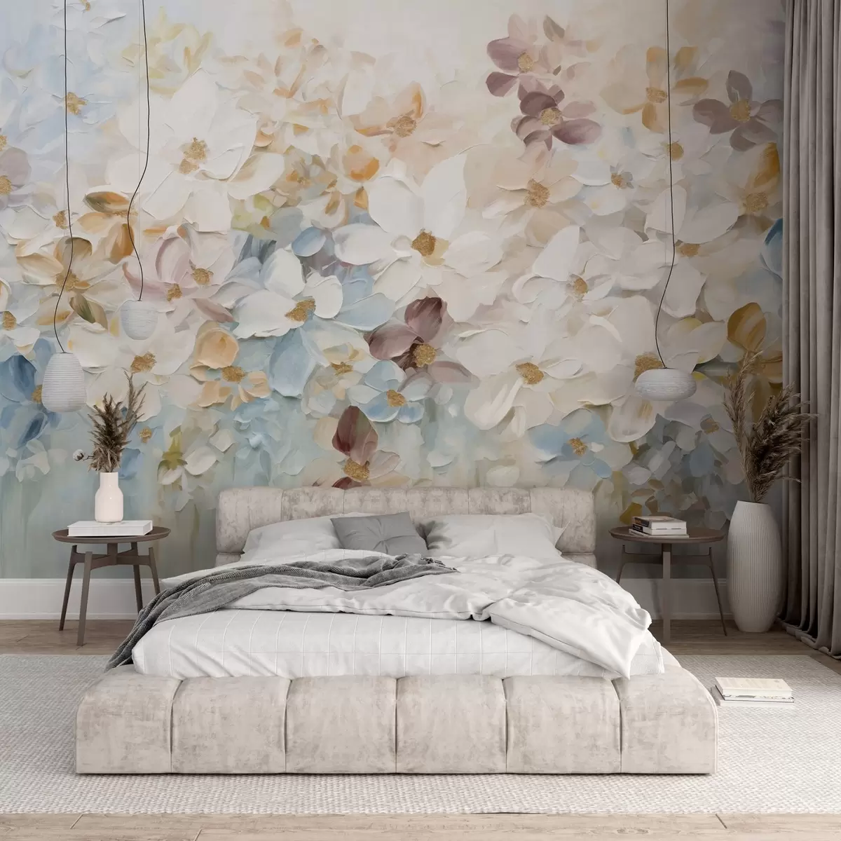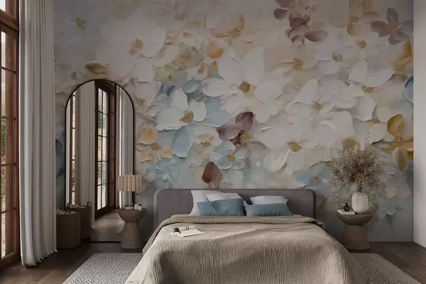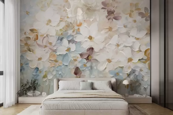 Murais de parede Pintura a óleo imitando um jardim de flores com flores brancas, azuis e laranjas, pinceladas suaves, cores pastéis suaves Nr. w09236v1