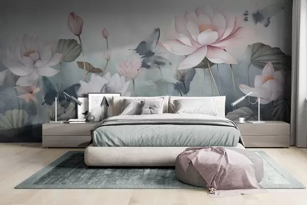 Murais de parede Flores texturizadas de lótus com pétalas em tons pastéis de rosa, folhas verdes, reflexo da água, cores pastéis suaves, efeito de aquarela Nr. w09254