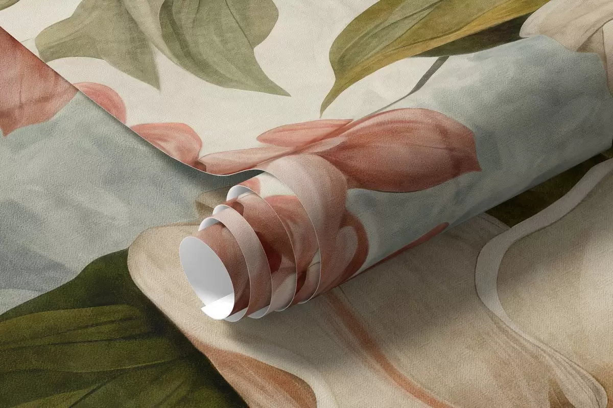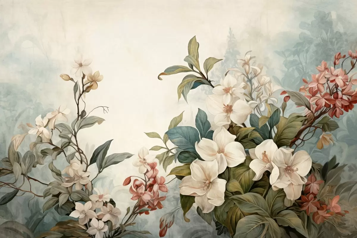 Murais de parede Flores e folhas tropicais texturizadas com tons suaves de azul e verde, pinceladas delicadas, estilo botânico vintage Nr. w09259