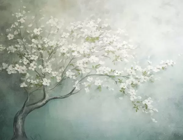 Murais de parede Uma árvore florescendo com flores brancas em plena floração, em um fundo com textura granulada e barulhenta de azul e verde suaves Nr. w09261