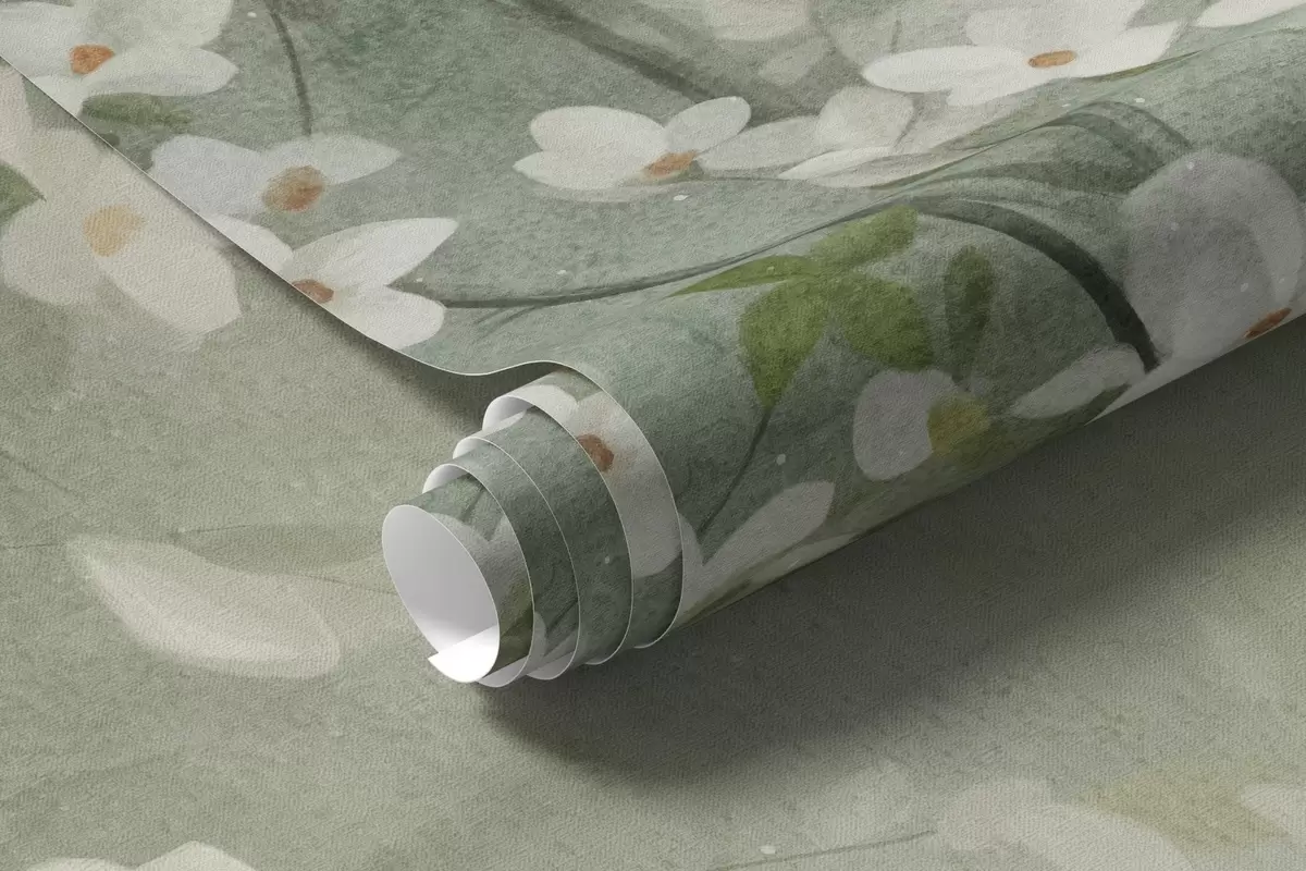 murais de parede Uma árvore florescendo com flores brancas em plena floração, em um fundo com textura granulada e barulhenta de azul e verde suaves w09261