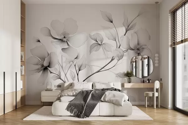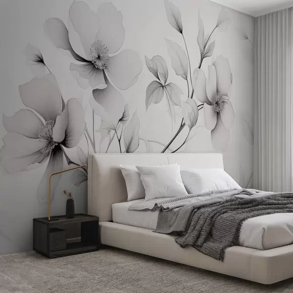 Murais de parede Flores em preto e branco com linhas elegantes em um fundo cinza Nr. w09271