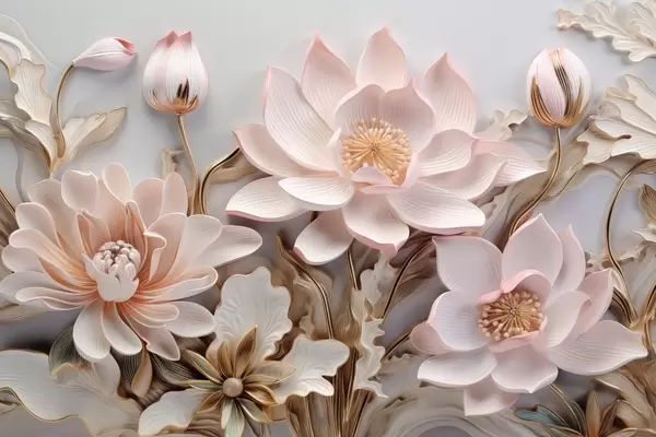 Murais de parede Flores rosa volumétricas com folhas amarelas Nr. w09277
