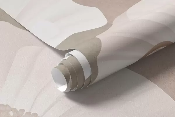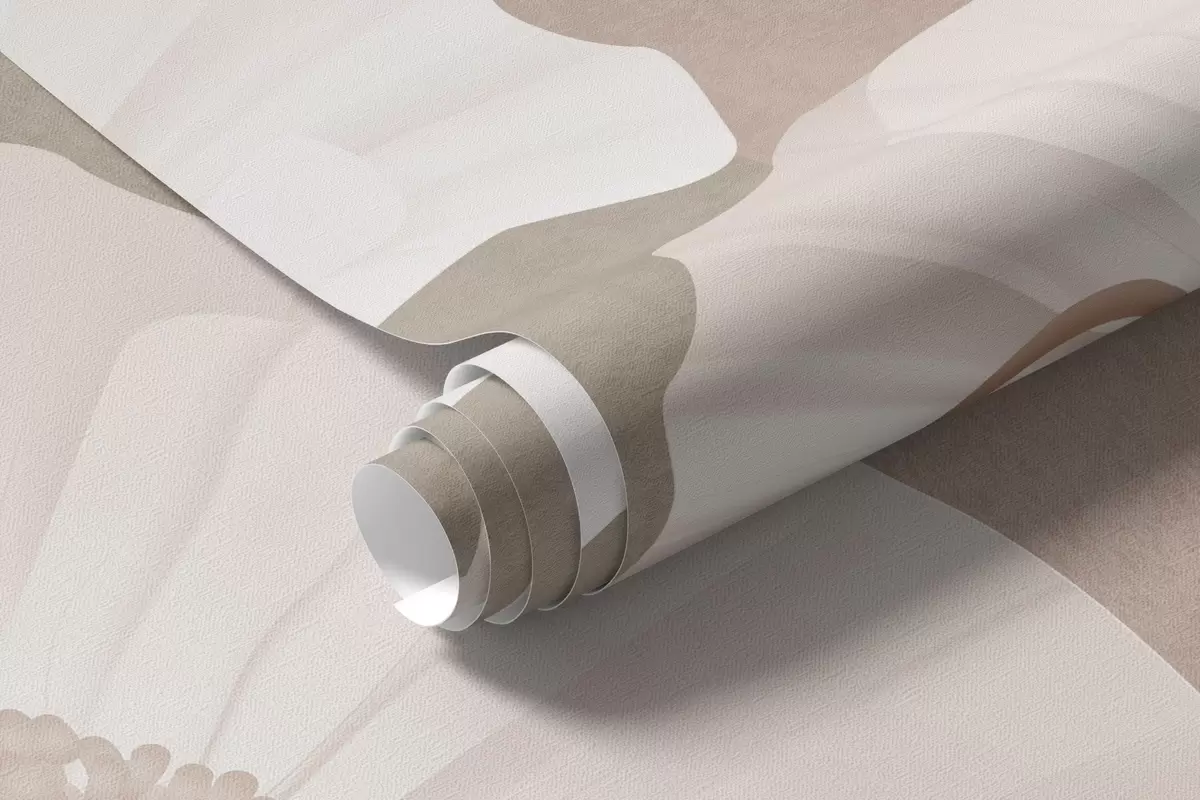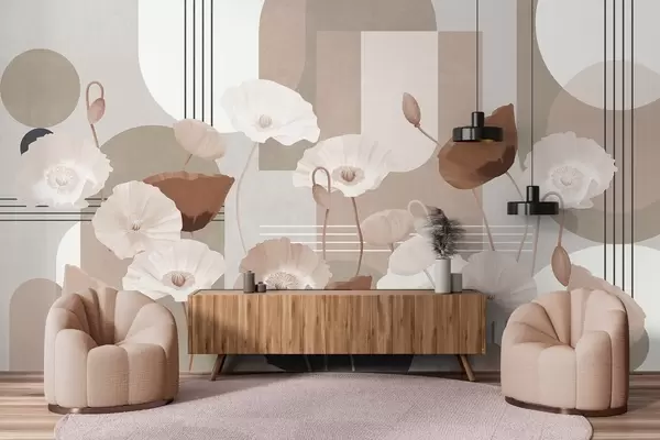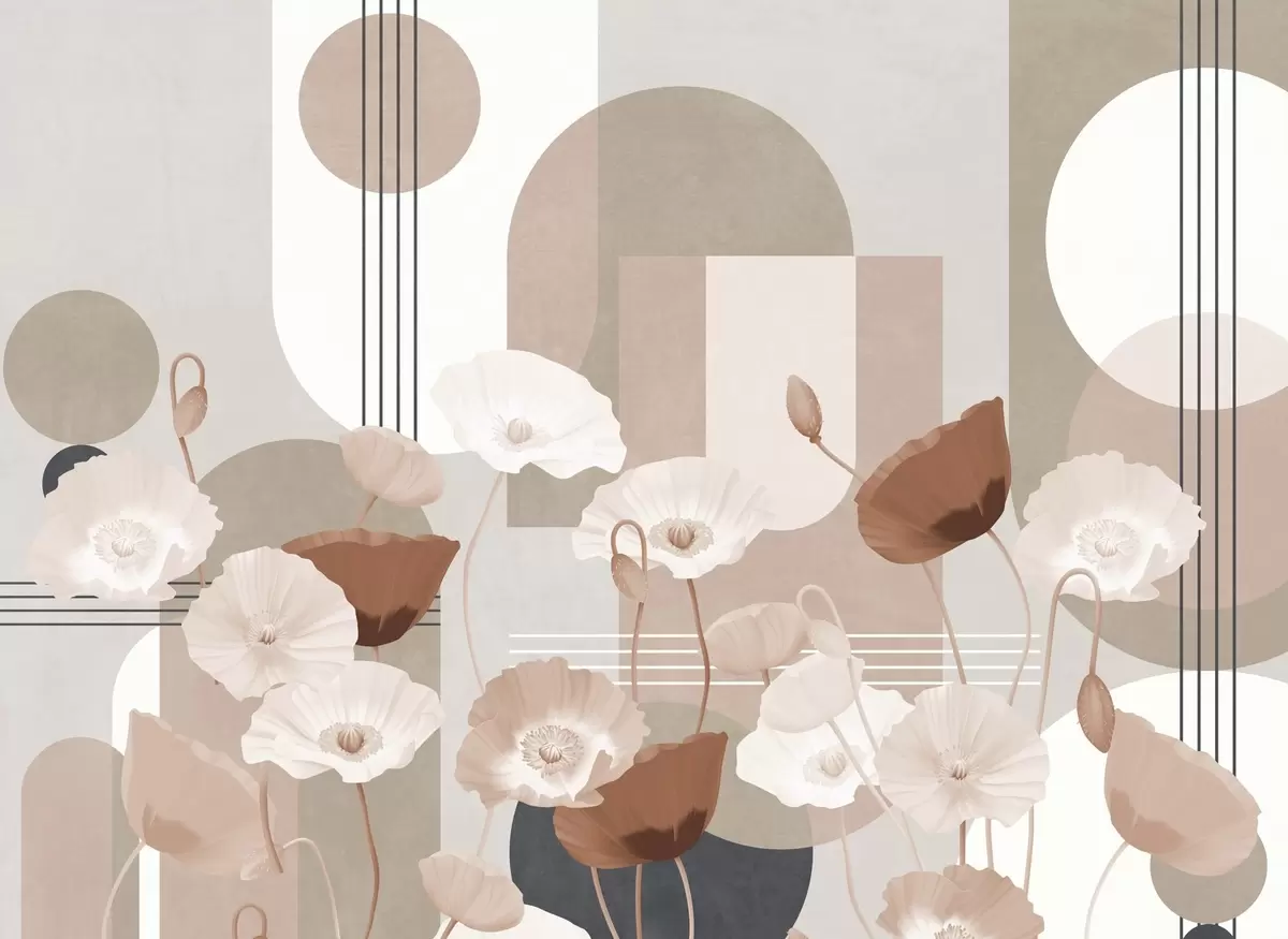 Murais de parede Papoulas nas cores branca e bege com formas geométricas no plano de fundo, círculos e arcos, estilo minimalista, cores suaves Nr. w09289