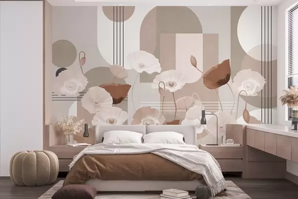 Murais de parede Papoulas nas cores branca e bege com formas geométricas no plano de fundo, círculos e arcos, estilo minimalista, cores suaves Nr. w09289