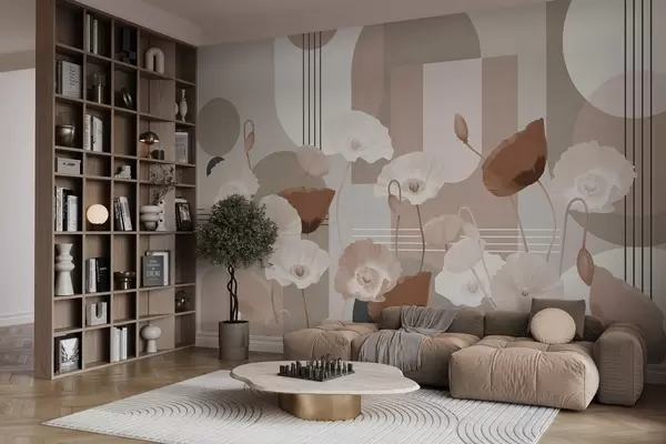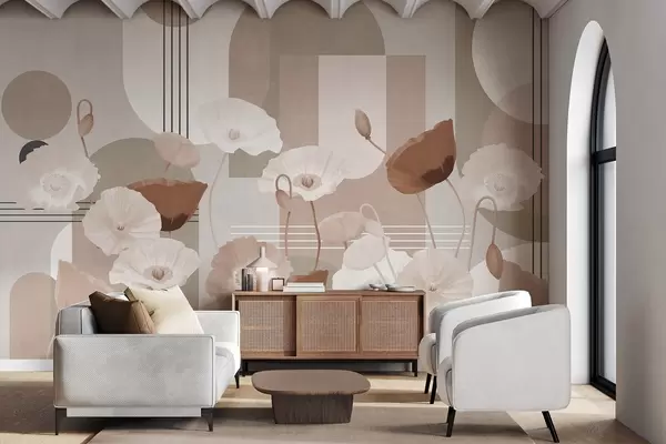 Murais de parede Papoulas nas cores branca e bege com formas geométricas no plano de fundo, círculos e arcos, estilo minimalista, cores suaves Nr. w09289