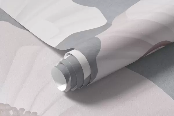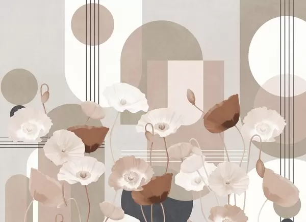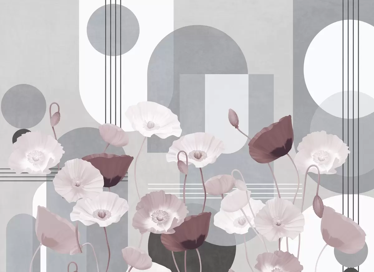 Murais de parede Papoulas nas cores branca e cinza com formas geométricas no plano de fundo, círculos e arcos, estilo minimalista, cores suaves Nr. w09289v1