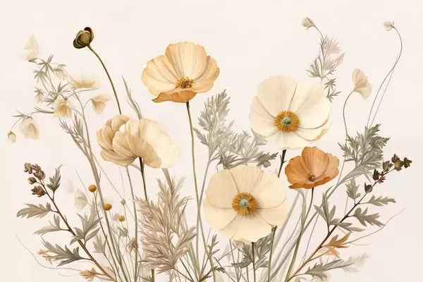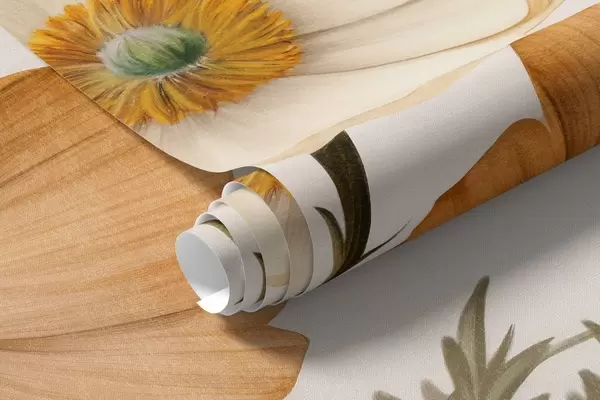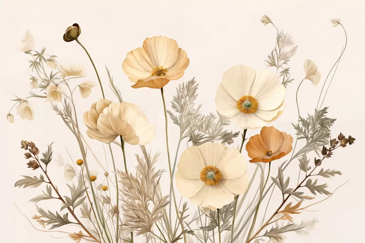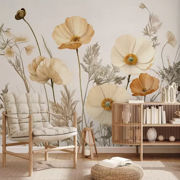Murais de parede Papoulas vintage texturizadas em laranja e branco com caules e folhas finos, fundo bege claro, estilo aquarela Nr. w09293