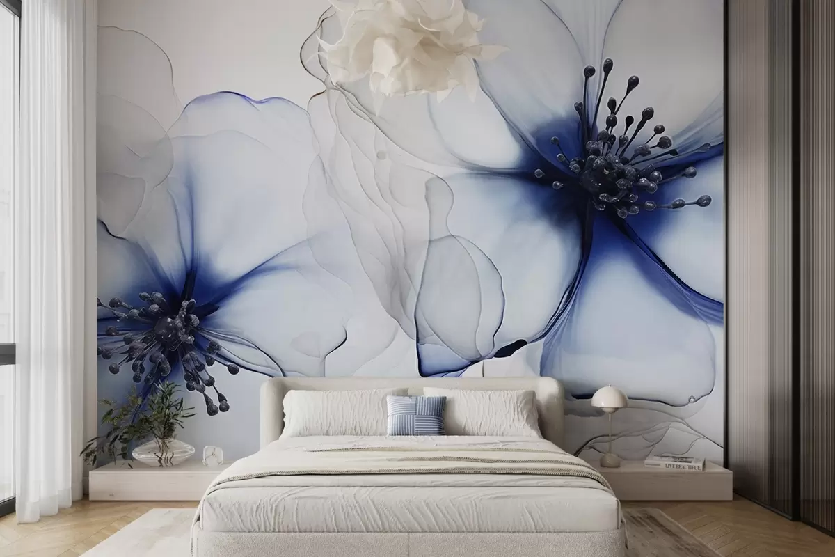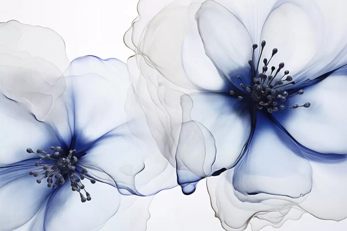 Murais de parede Duas flores azuis translúcidas texturizadas com estames visíveis, pétalas delicadas sobrepostas e uma textura suave e fluida Nr. w09295v1
