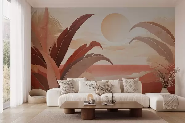 murais de parede Paisagem abstrata tropical texturizada com folhas de palmeira e um grande sol no céu, paleta de cores quentes, estilo minimalista, estilizado w09296