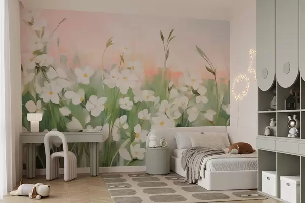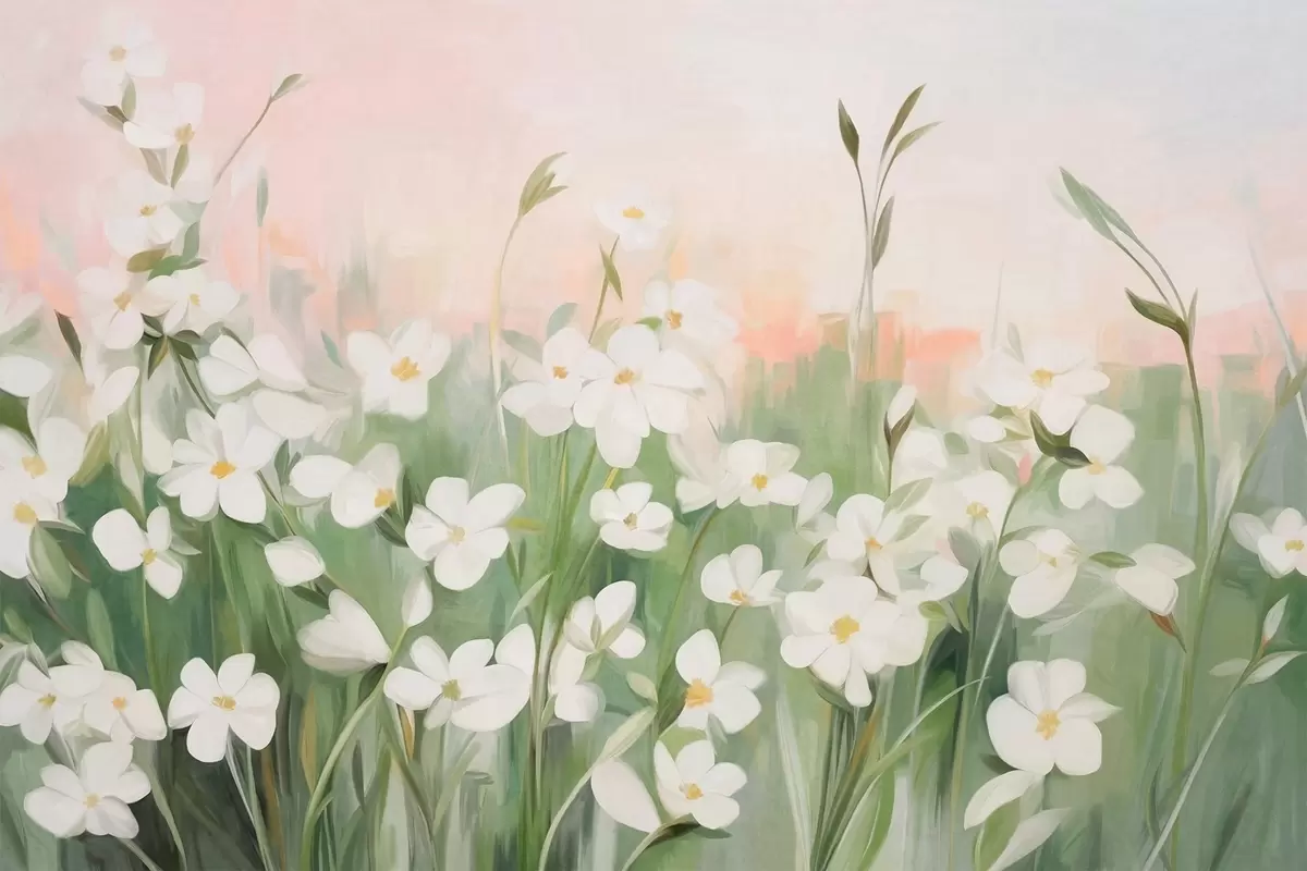 Murais de parede Campo abstrato de flores silvestres com caules e folhas verdes, contra um céu texturizado em tons suaves de rosa e branco. Nr. w09297