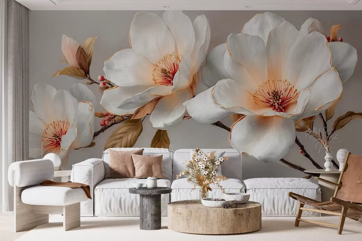 Murais de parede Flores delicadas em um galho em tons pastéis com centros laranja Nr. w09299