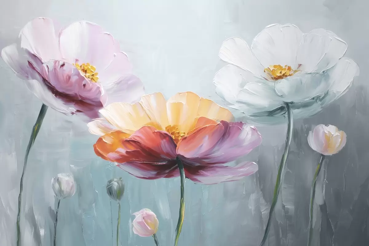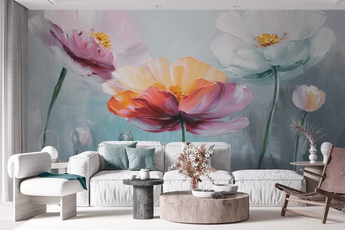 Murais de parede Flores brilhantes em técnica de pintura a óleo em um fundo azul Nr. w09310
