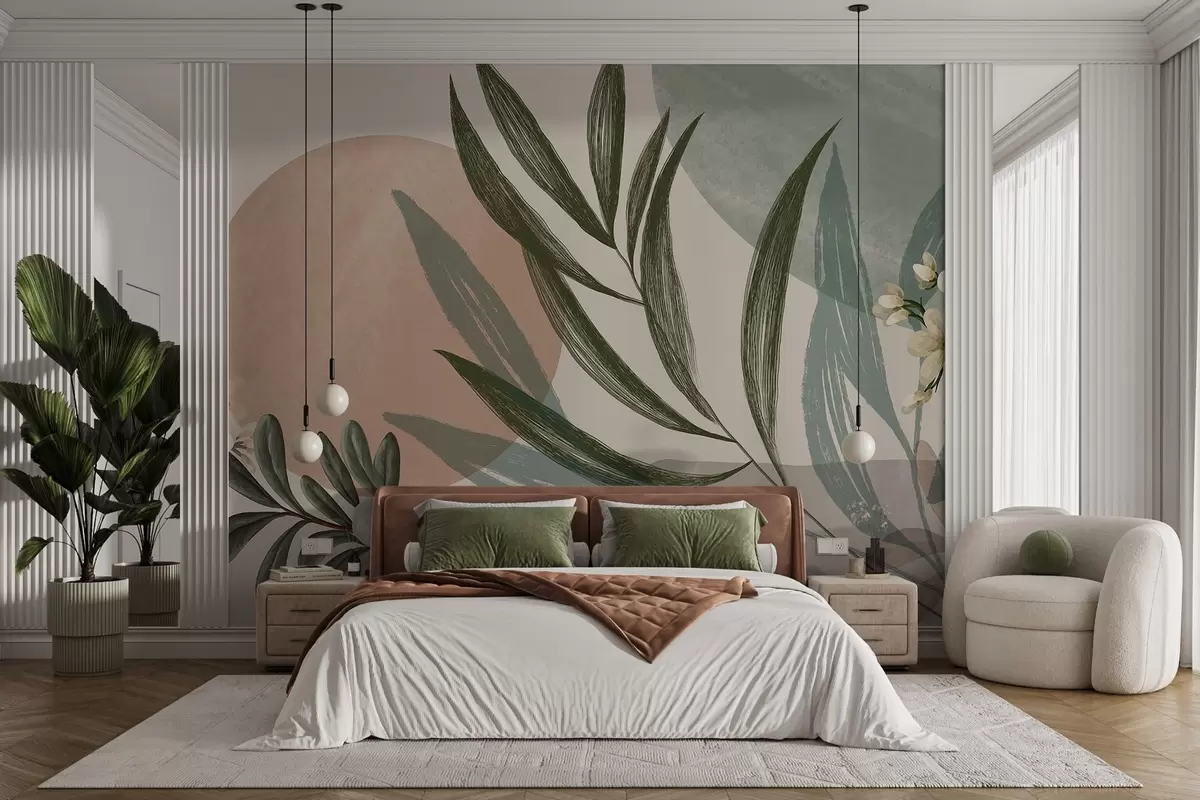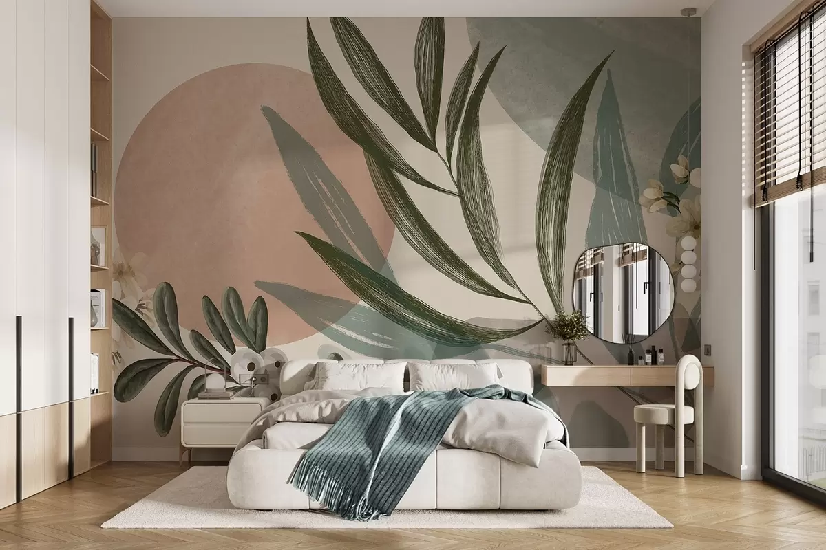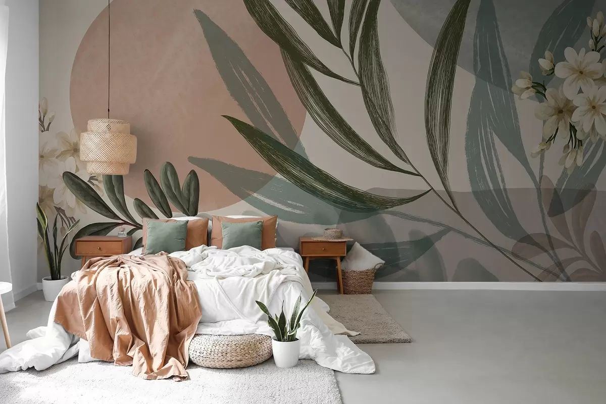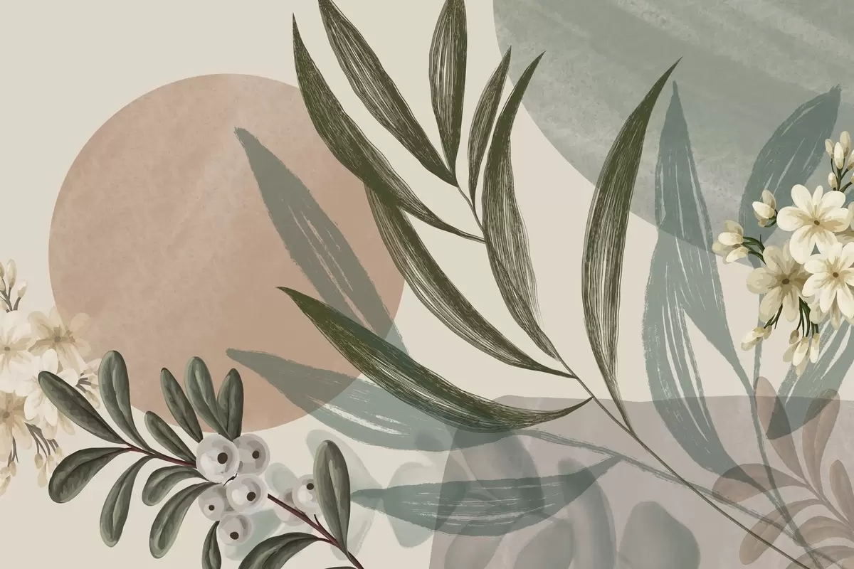 Murais de parede Arte botânica abstrata com folhas de palmeira verdes e bagas brancas, em um fundo de formas em tons de terra suaves Nr. w09312
