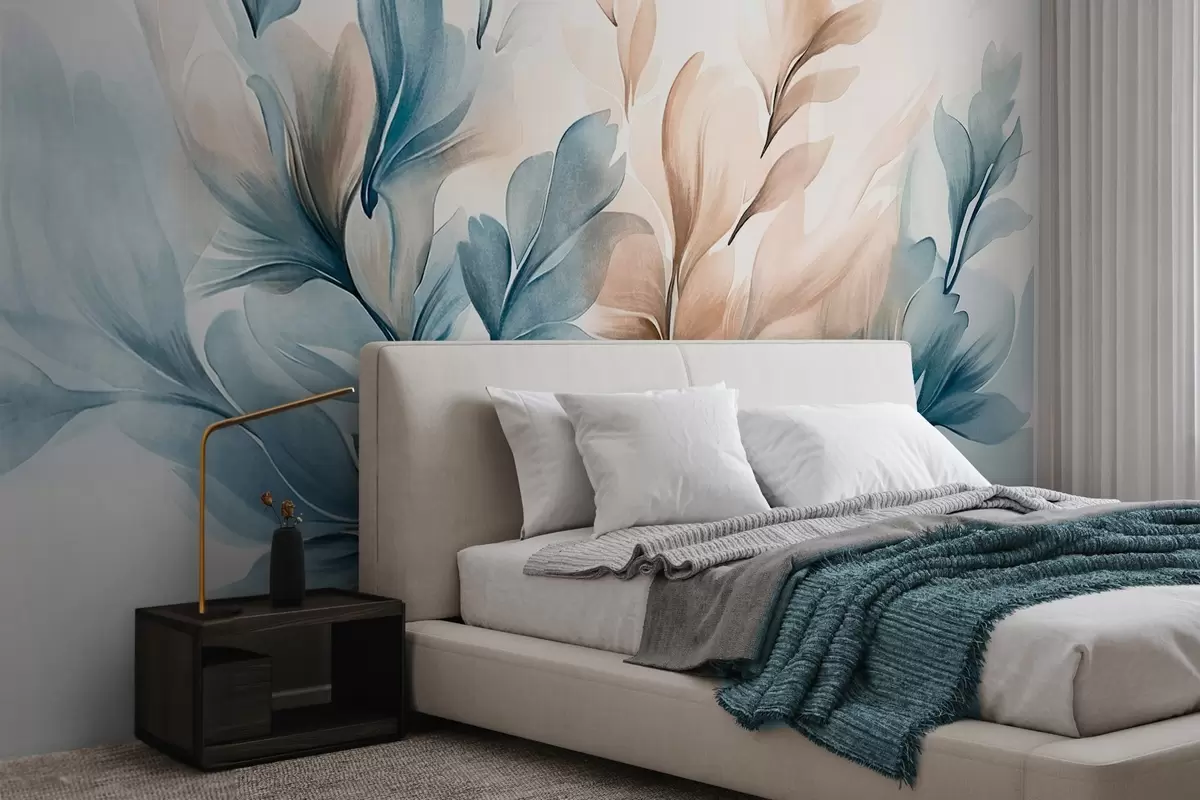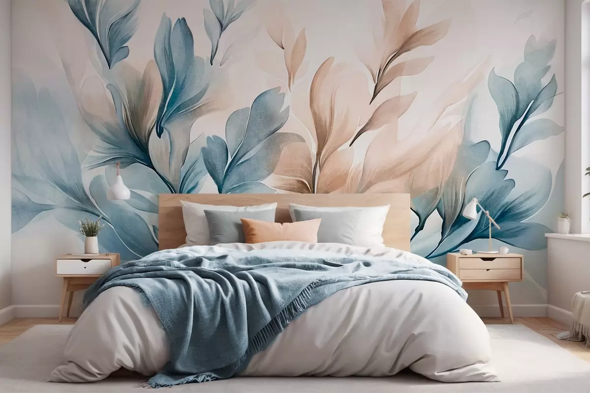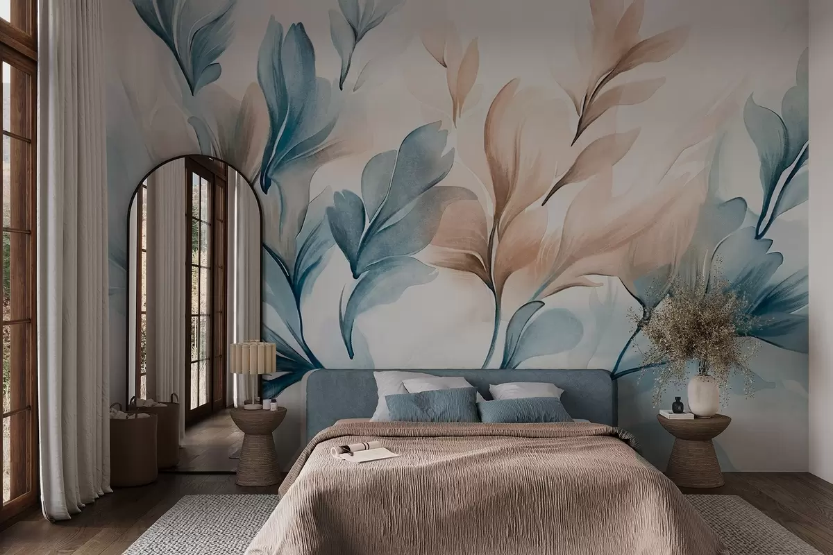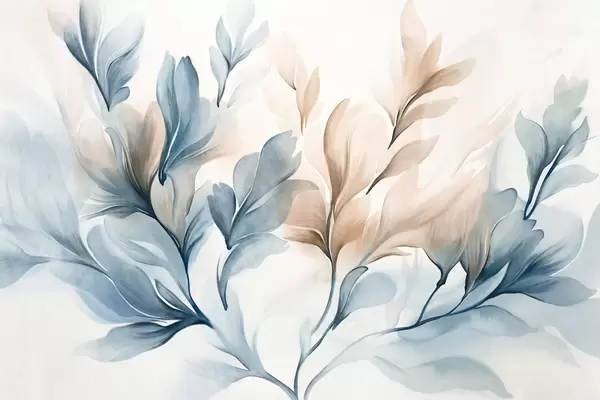 Murais de parede Folhas abstratas azuis e marrons com pinceladas visíveis, leves e texturizadas, paleta de cores suaves, efeito de aquarela Nr. w09313
