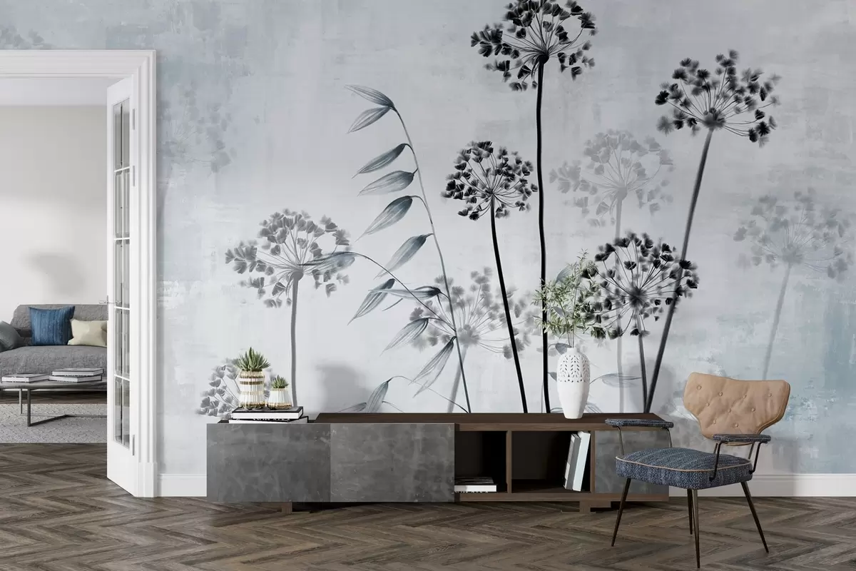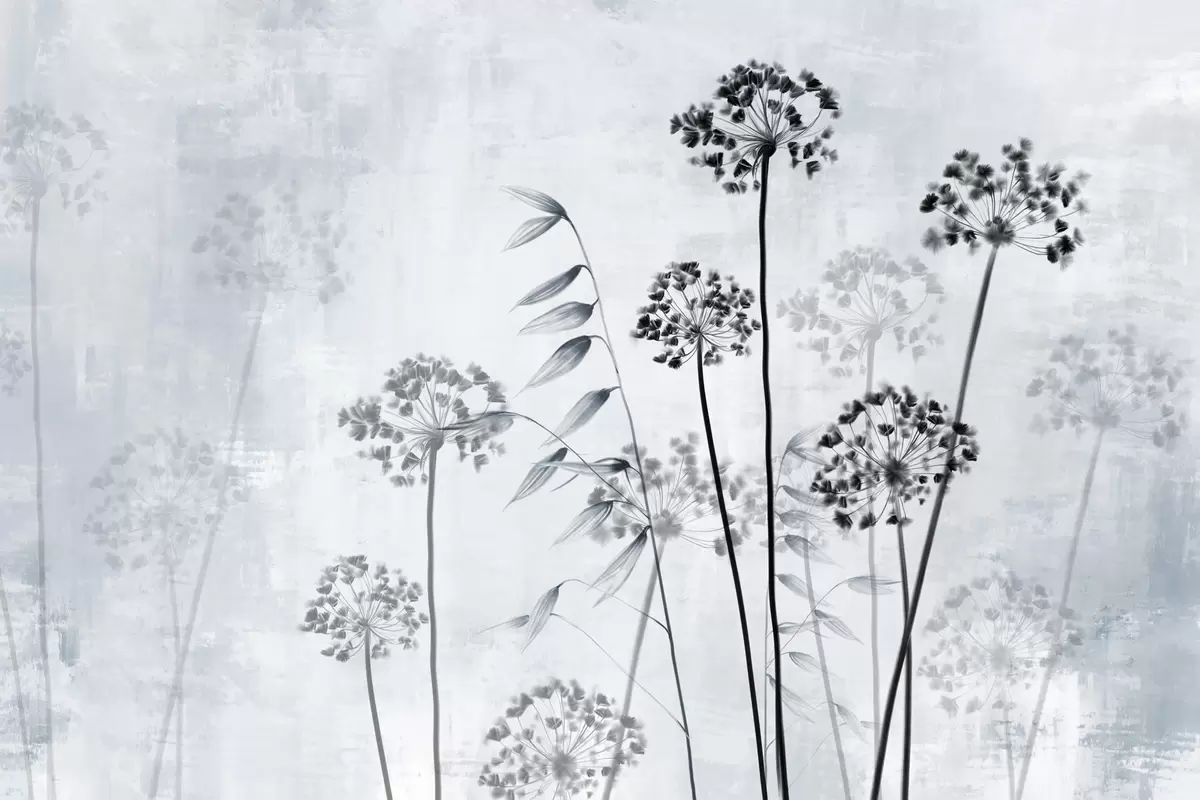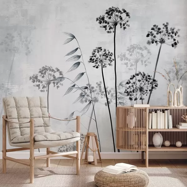 Murais de parede Desenho de flores secas com hastes longas, paleta monocromática, contra um fundo cinza claro texturizado, ilustração botânica Nr. w09314