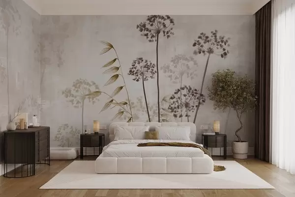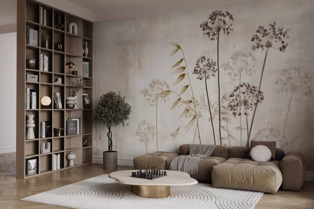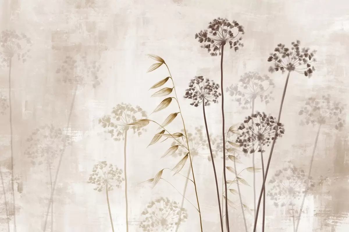 Murais de parede Desenho de flores secas com hastes longas, paleta monocromática, em um fundo bege claro e texturizado, ilustração botânica Nr. w09314v1