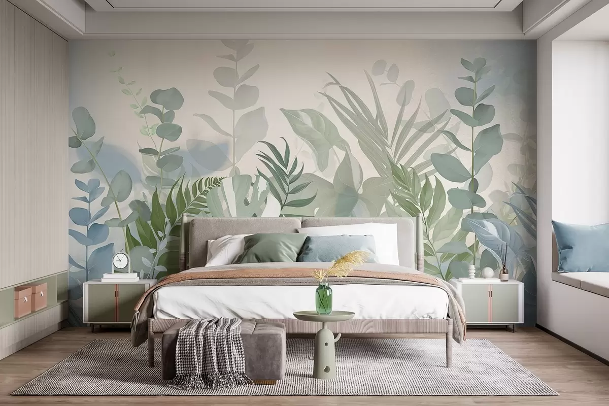 Murais de parede Plantas verdes em tons pastéis, samambaias, monstera e eucalipto, fundo com textura clara, iluminação suave, tranquilidade, ilustração botânica Nr. w09316