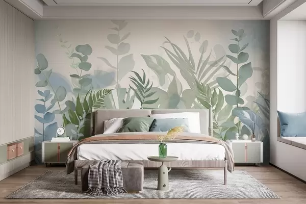 murais de parede Plantas verdes em tons pastéis, samambaias, monstera e eucalipto, fundo com textura clara, iluminação suave, tranquilidade, ilustração botânica w09316