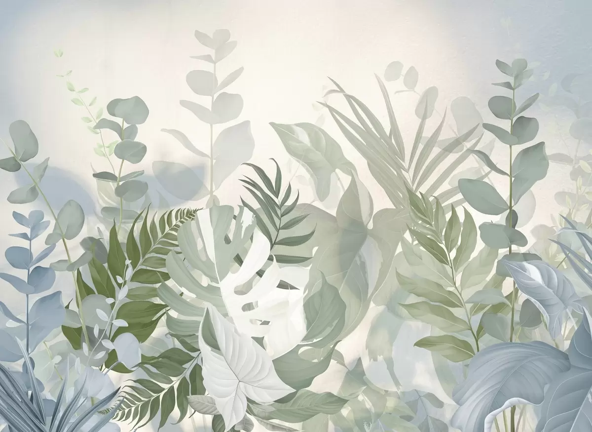Murais de parede Plantas verdes em tons pastéis, samambaias, monstera e eucalipto, fundo com textura clara, iluminação suave, tranquilidade, ilustração botânica Nr. w09316