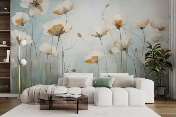 Murais de parede Papoulas brancas texturizadas em hastes longas, fundo azul claro e verde, pinceladas suaves, arranjo de campo floral delicado Nr. w09317
