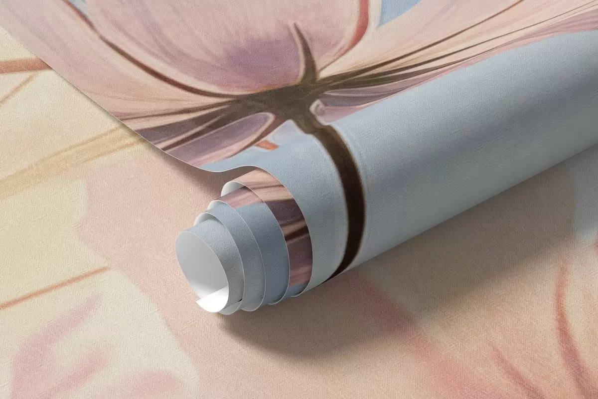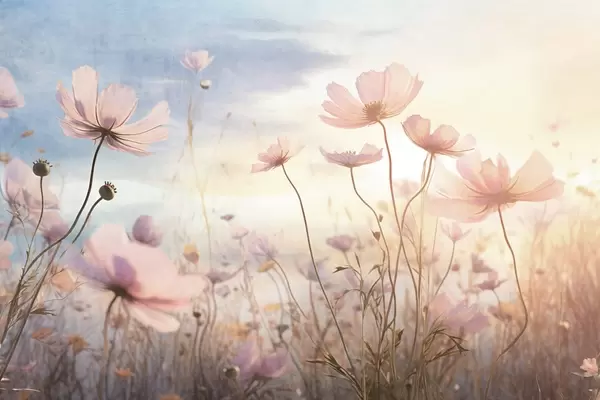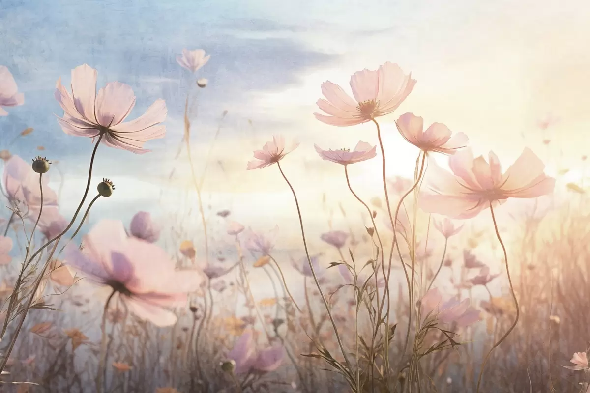 Murais de parede Um campo de flores rosa texturizadas com hastes longas, contra um céu azul e amarelo suave, criando uma atmosfera de sonho Nr. w09320