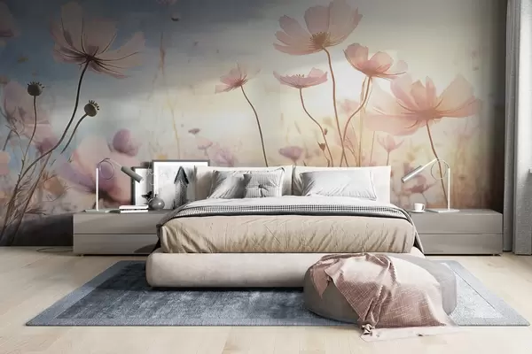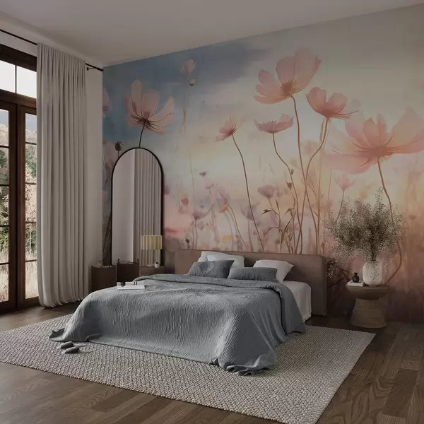 Murais de parede Um campo de flores rosa texturizadas com hastes longas, contra um céu azul e amarelo suave, criando uma atmosfera de sonho Nr. w09320