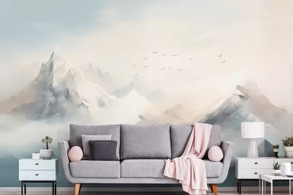 Murais de parede Picos de montanhas cobertos de neve na névoa da manhã com pássaros voando Nr. w09326