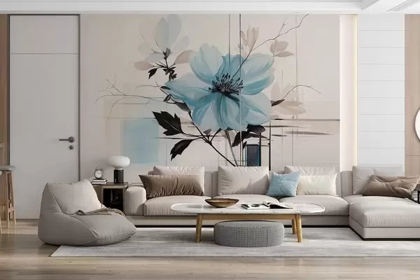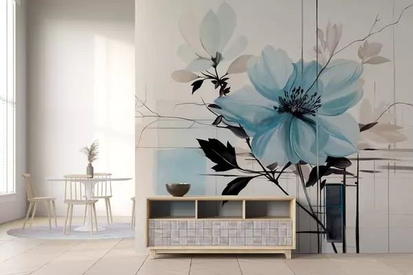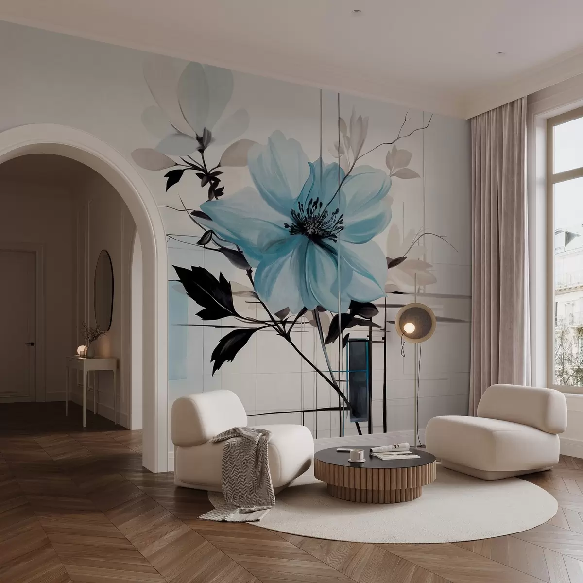 Murais de parede Flor azul abstrata texturizada com folhas e galhos escuros, formas geométricas minimalistas e linhas em cores suaves Nr. w09332
