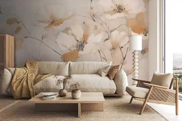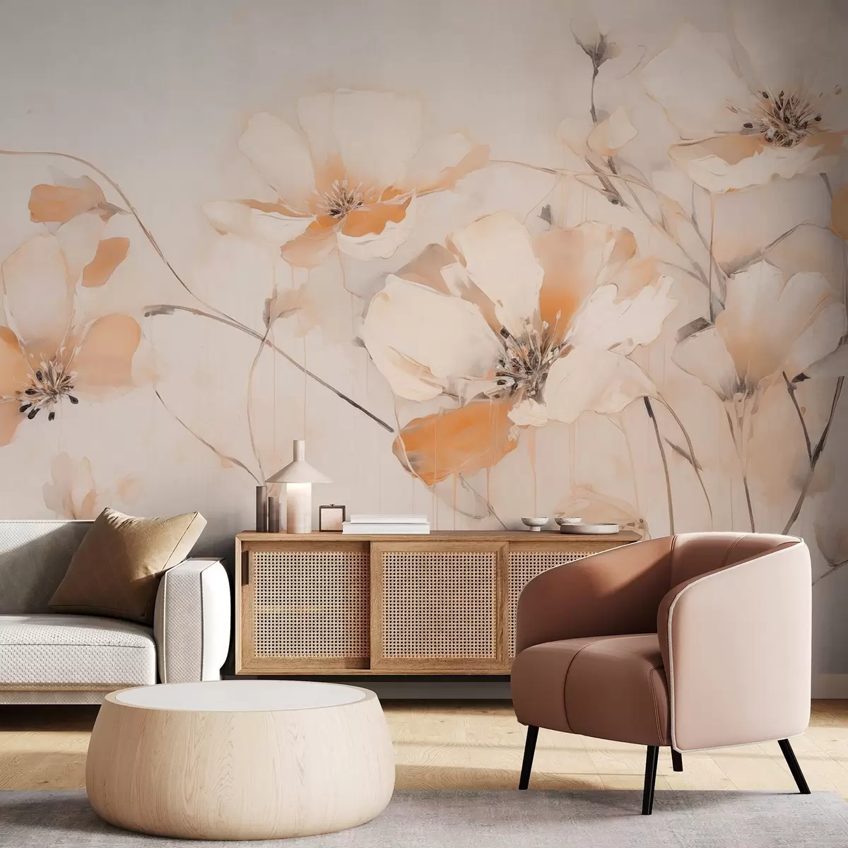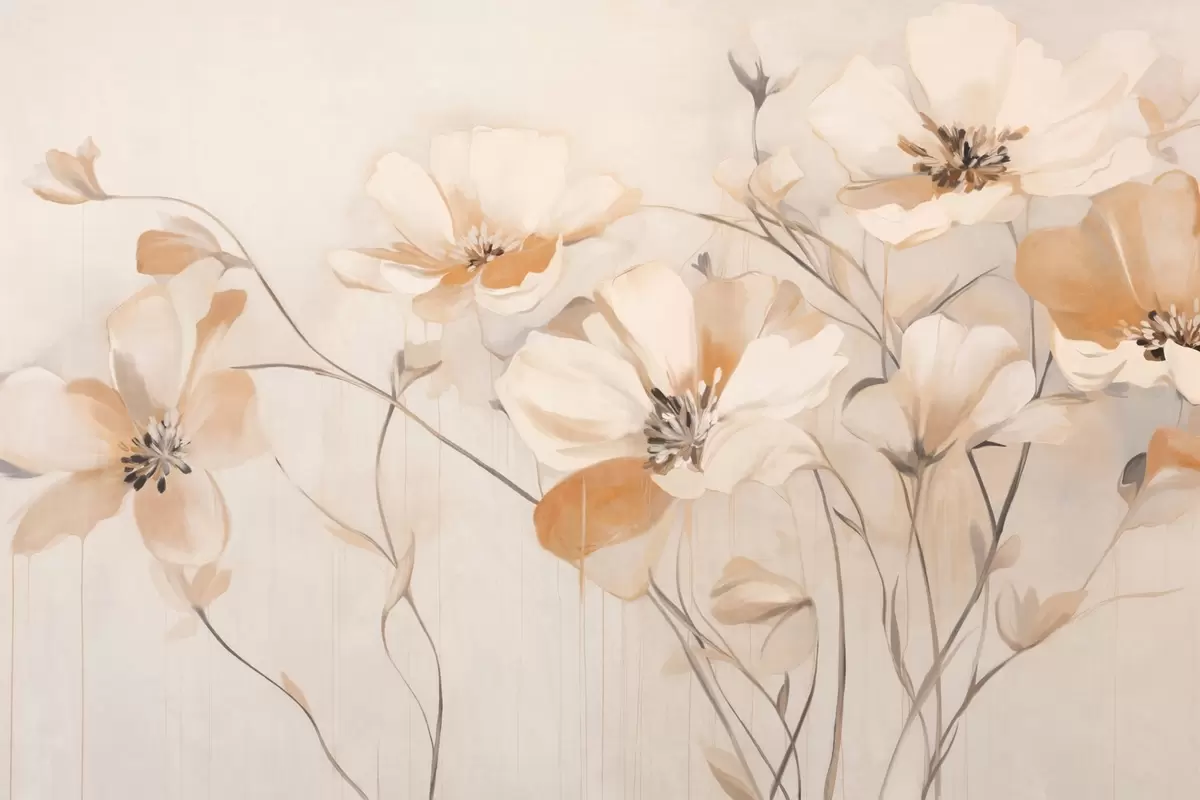 Murais de parede Flores brancas e laranja texturizadas com hastes longas, fundo claro, cores suaves, composição elegante, pinceladas delicadas Nr. w09335