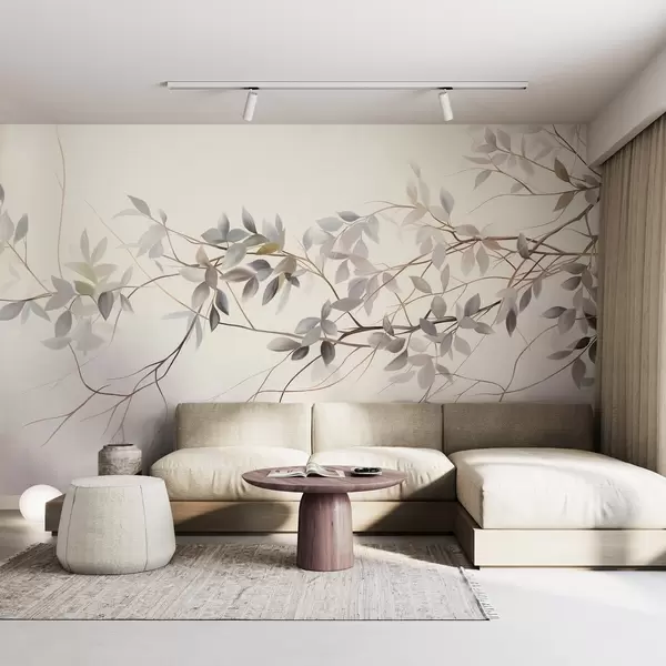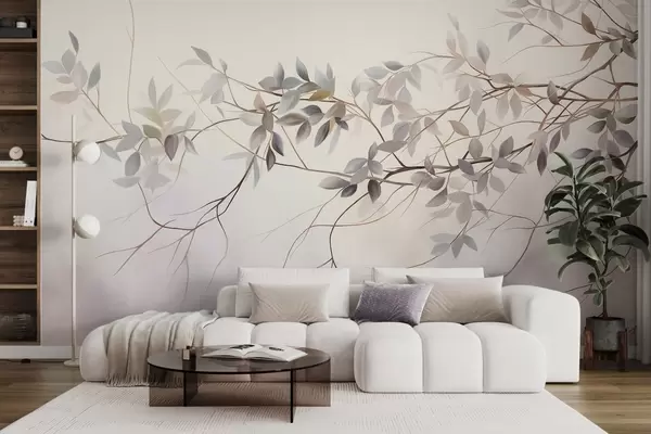 Murais de parede Galhos delicados com textura e folhas em tons suaves de cinza, roxo e verde contra um fundo suave e desfocado. Nr. w09336