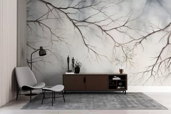 Murais de parede Galhos de árvores com efeito texturizado de aquarela, detalhes intrincados, paleta de cores suaves, contra um fundo claro Nr. w09337