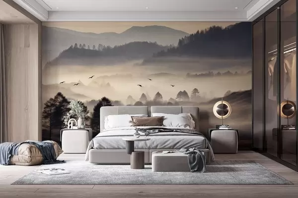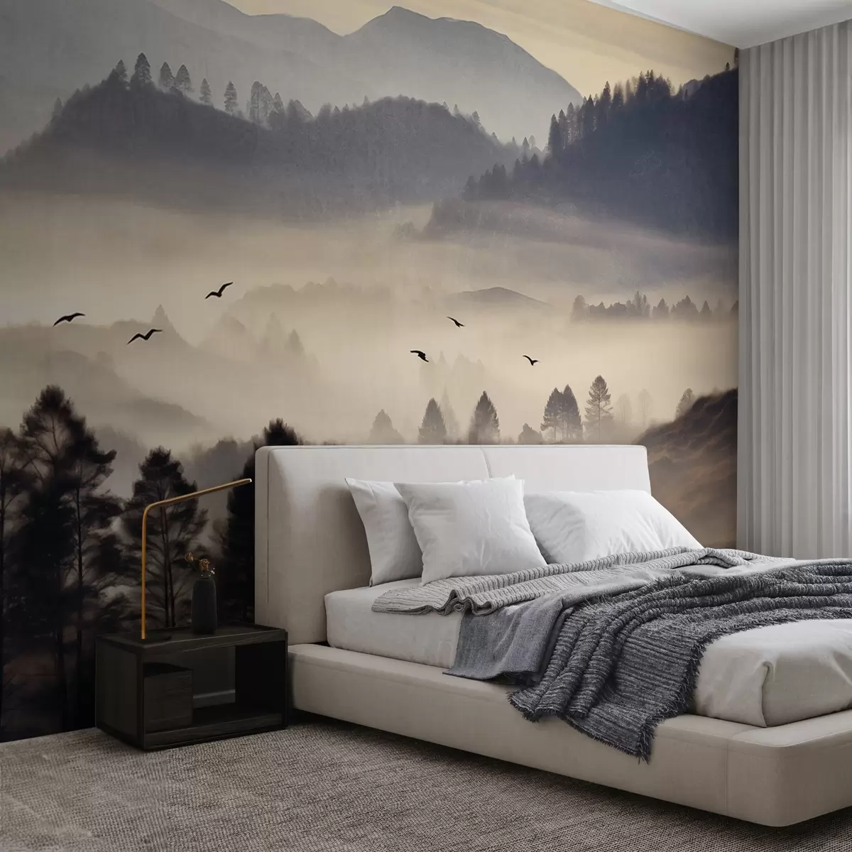 murais de parede Paisagem montanhosa texturizada com camadas de neblina, árvores em silhueta no primeiro plano, cadeia de montanhas distante, iluminação suave w09338