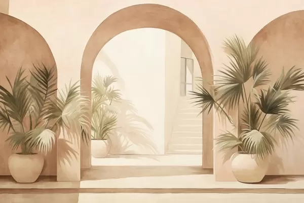 Murais de parede Arcos texturizados com vasos de plantas, paleta de cores bege claro, design minimalista, escada ao fundo Nr. w09339