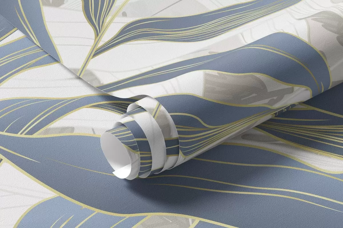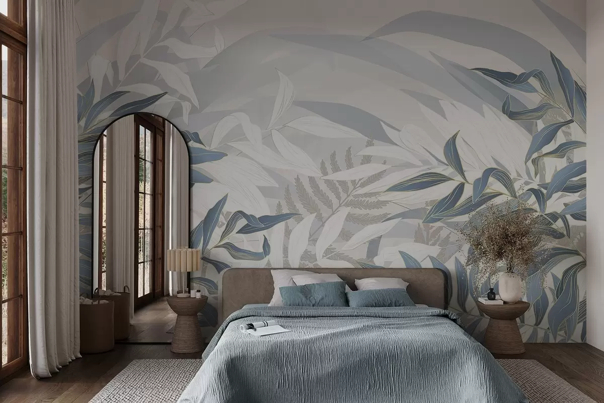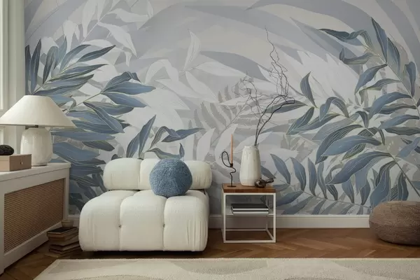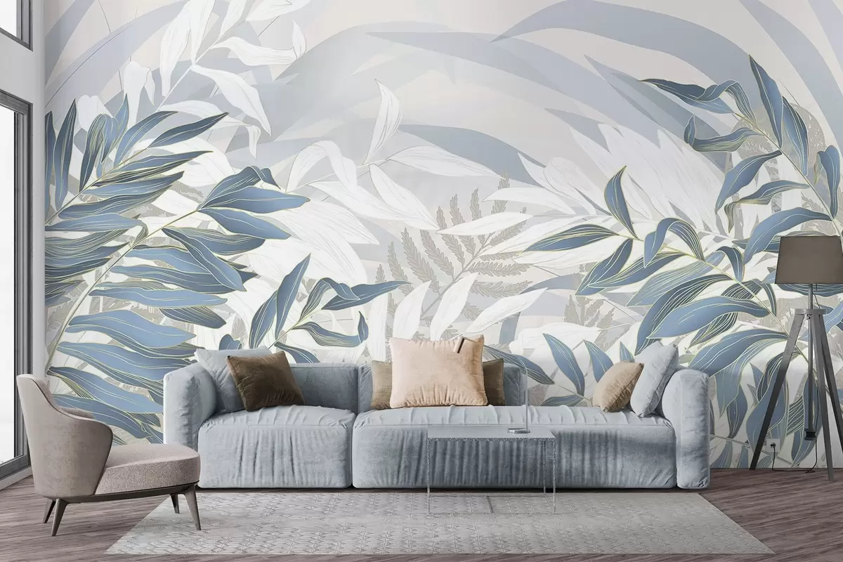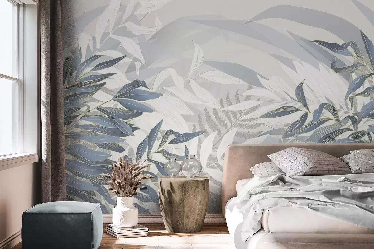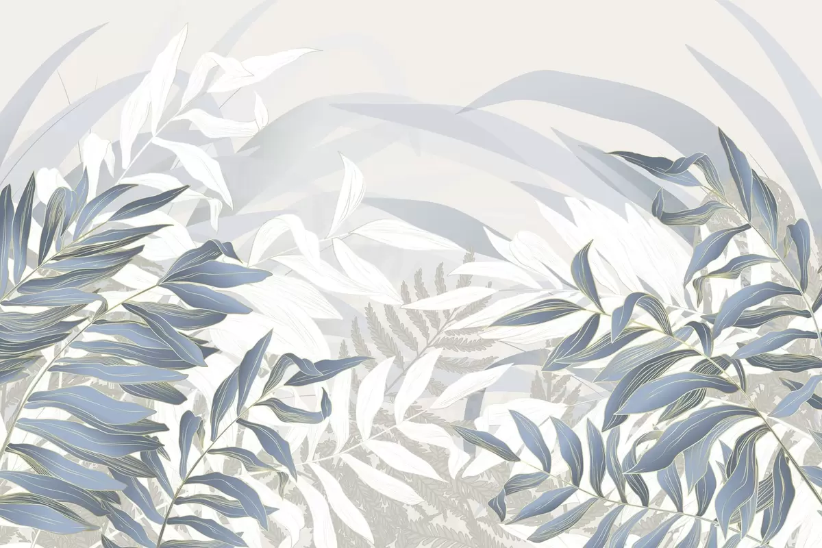 Murais de parede Folhas e grama azuis e brancas, cores pastéis suaves, ilustração botânica, design minimalista, decorativo, moderno Nr. w09341
