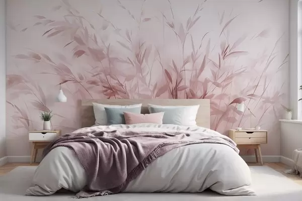 Murais de parede Grama e ervas daninhas com folhas e caules finos, cores rosa claro, pinceladas suaves e delicadas, impressão minimalista Nr. w09342v2