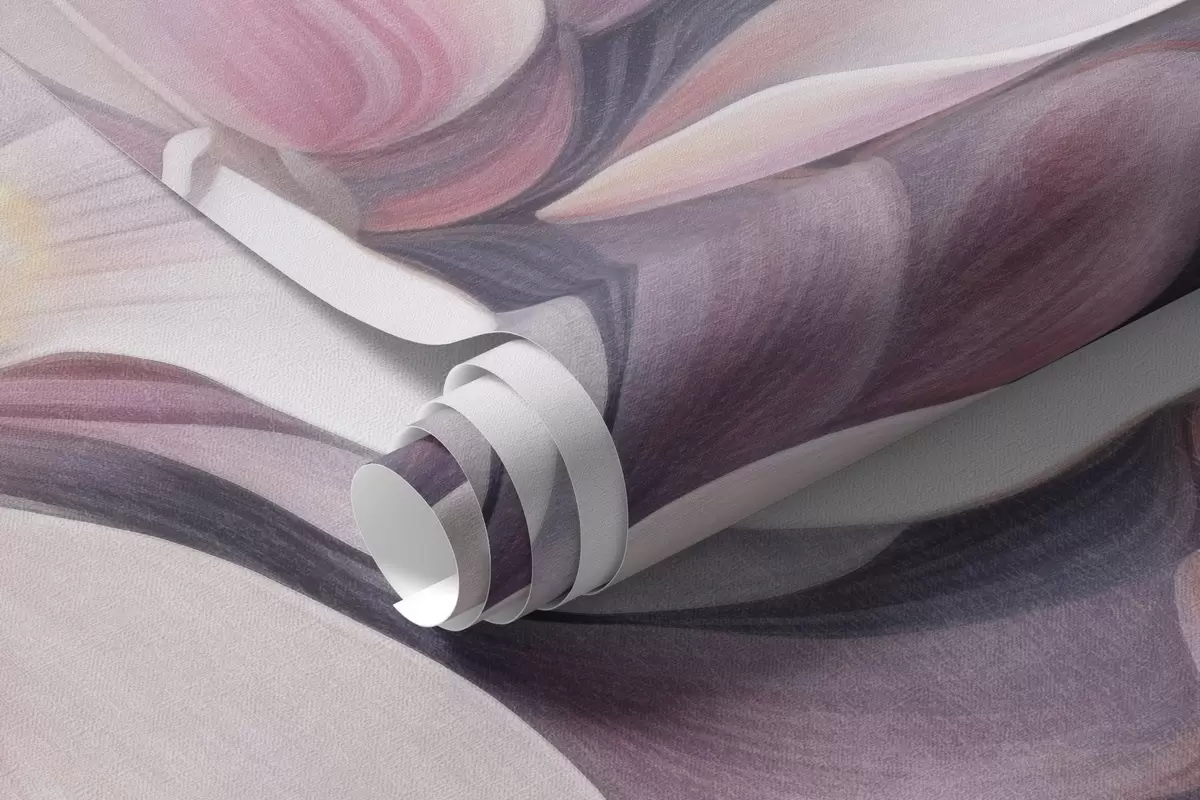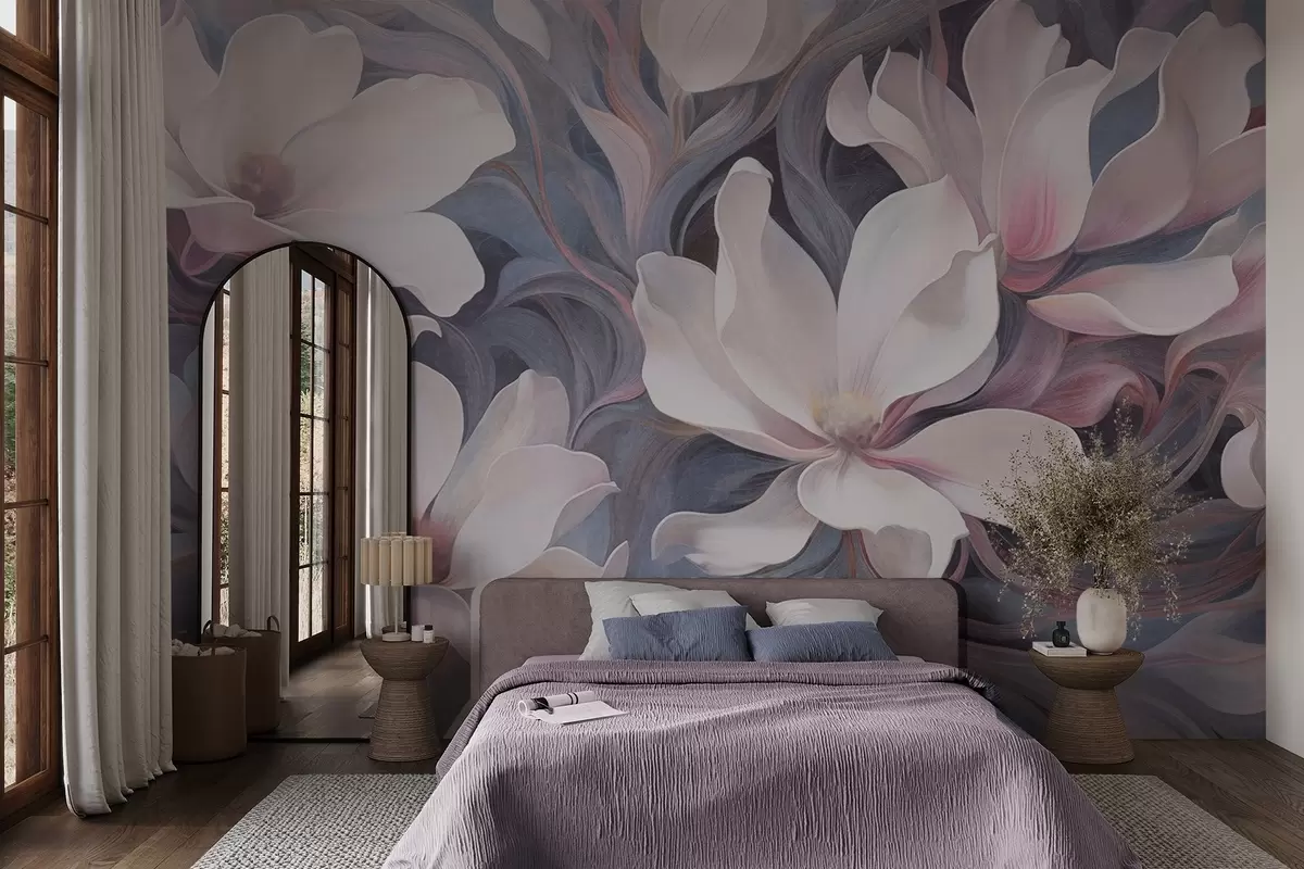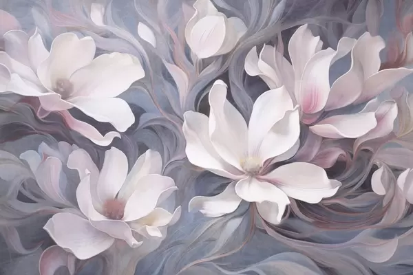 Murais de parede Pintura texturizada de flores de magnólia brancas com detalhes em rosa, em um fundo de tons de azul e cinza suaves Nr. w09344