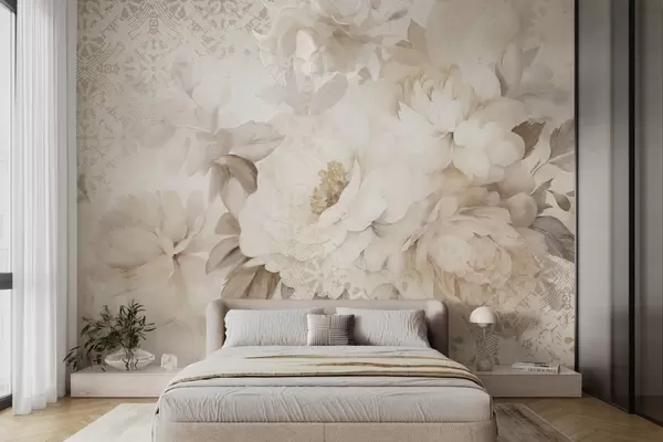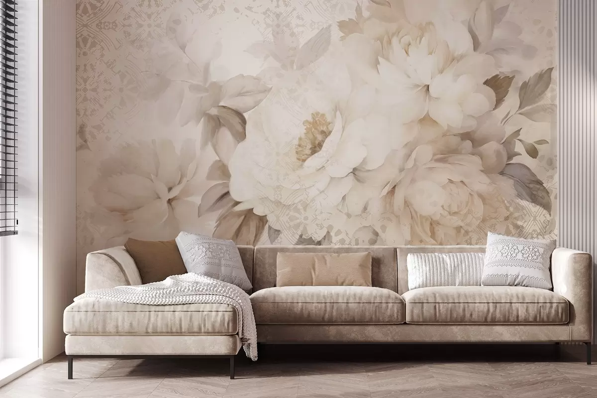 Murais de parede Um arranjo floral de peônias brancas com folhas bege, sobre um fundo decorativo com uma textura vintage Nr. w09345