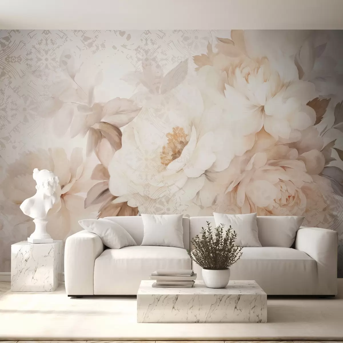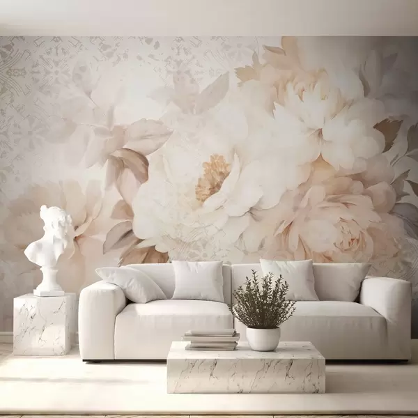 Murais de parede Um arranjo floral de peônias brancas com folhas bege, sobre um fundo decorativo com uma textura vintage Nr. w09345