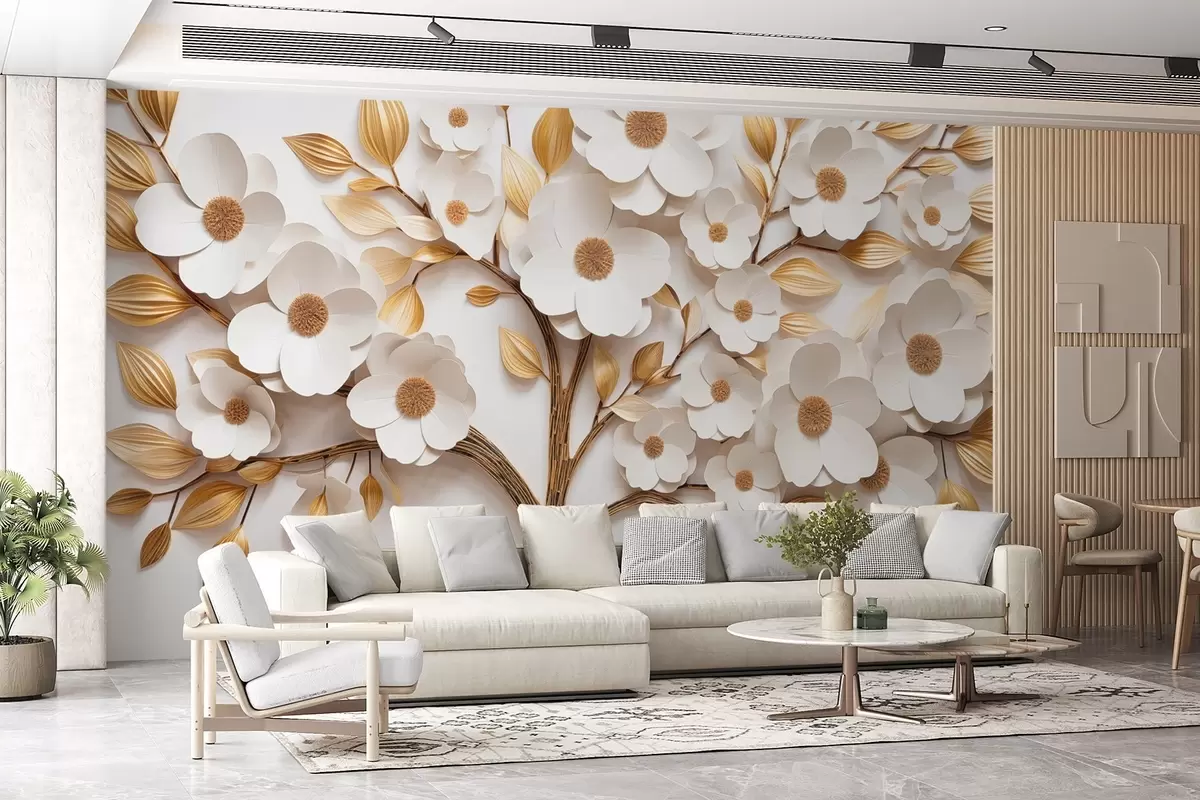 murais de parede Árvore com flores brancas e imitação de folhas em relevo w09348