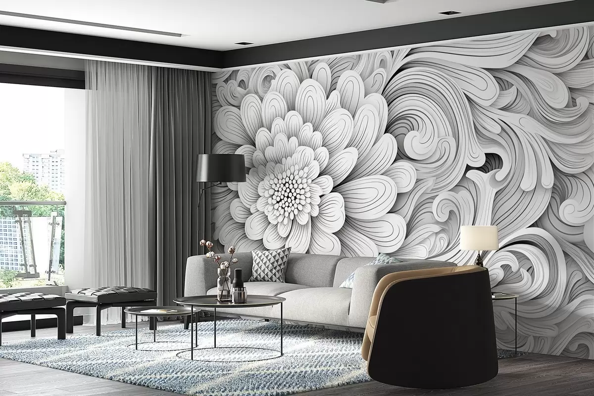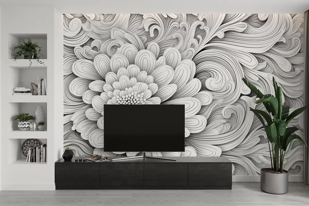 Murais de parede Padrão decorativo em preto e branco na forma de uma flor e redemoinhos Nr. w09355
