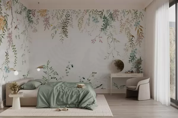 Murais de parede Ilustração botânica com samambaias, grama e plantas suspensas, em tons pastéis, sobre fundo branco, estilo aquarela texturizada Nr. w09364