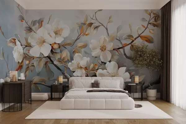 Murais de parede Flores brancas com pistilos amarelos em um galho de árvore com folhas, fundo claro, estilo de pintura vintage, impressão texturizada Nr. w09368