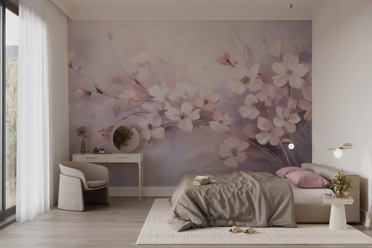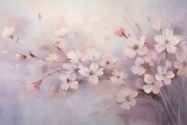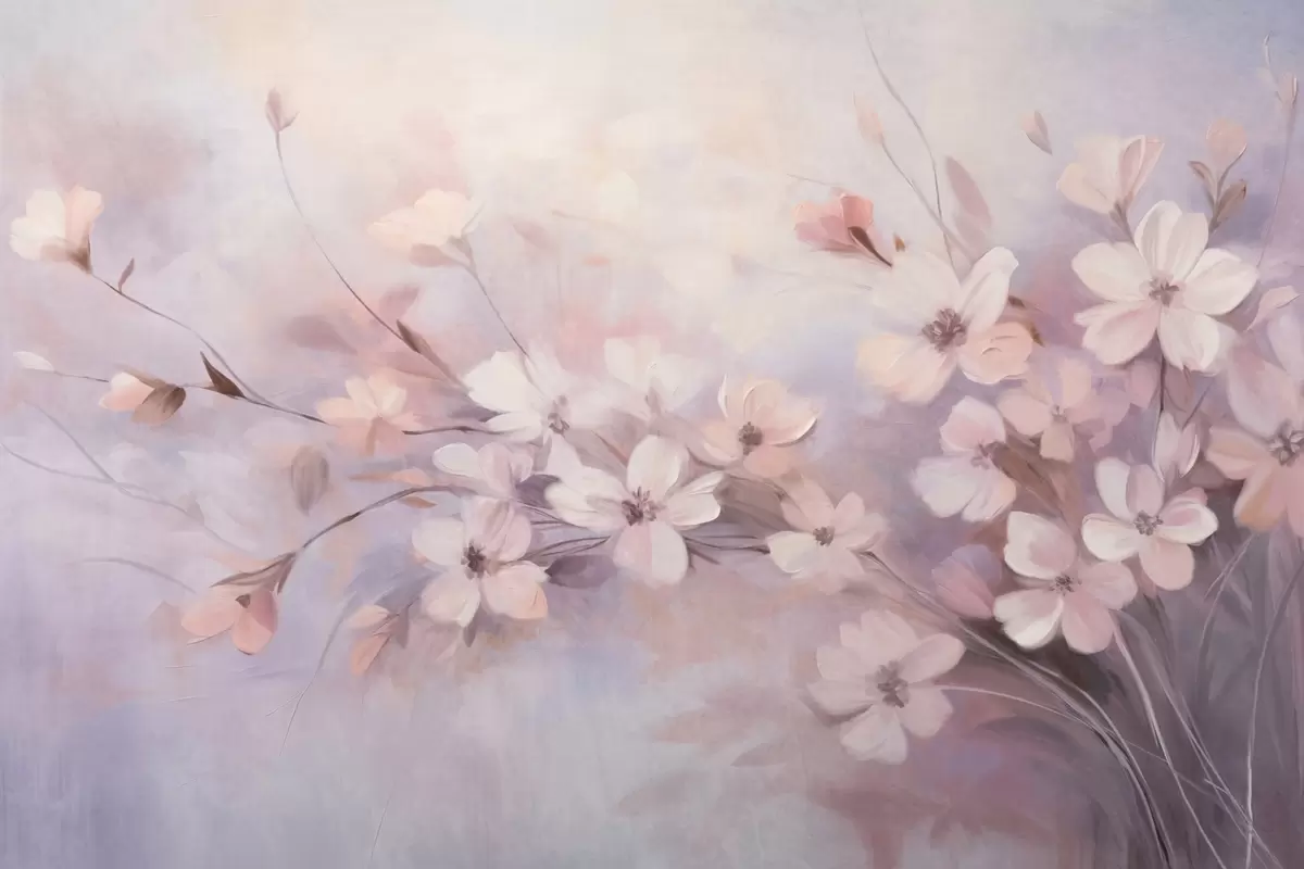 Murais de parede Um arranjo floral com flores delicadas com bordas suaves e desfocadas, em um fundo pastel de tons de lavanda e rosa claro Nr. w09369