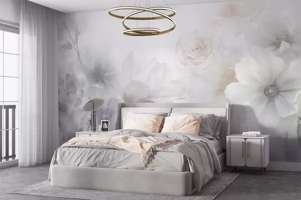 Murais de parede Um delicado arranjo floral abstrato com rosas rosa pastel e magnólias, foco suave, fundo cinza claro Nr. w09371