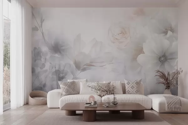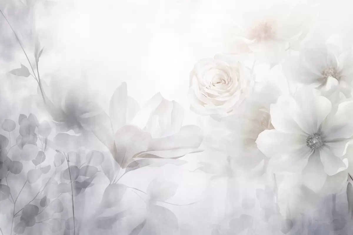 Murais de parede Um delicado arranjo floral abstrato com rosas rosa pastel e magnólias, foco suave, fundo cinza claro Nr. w09371