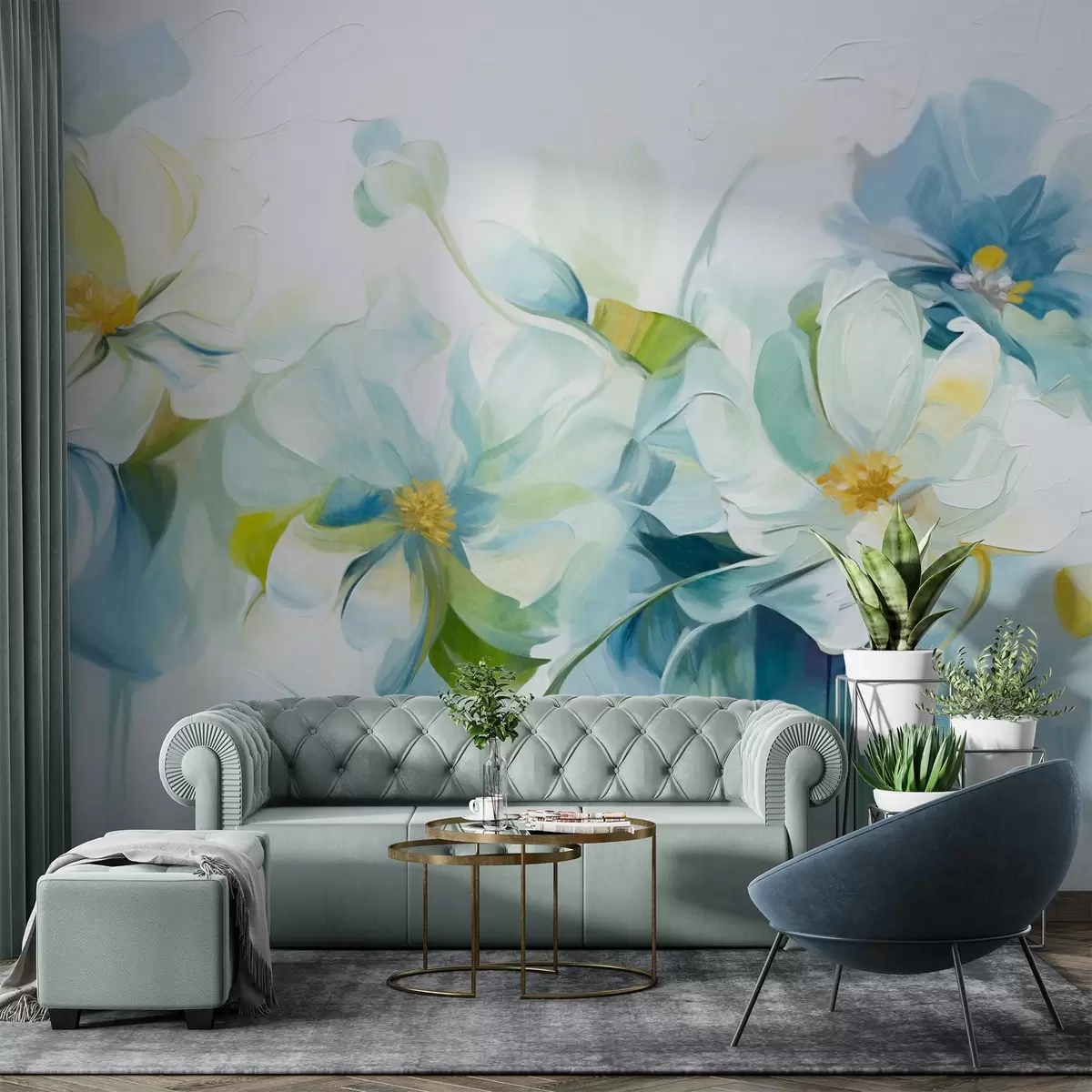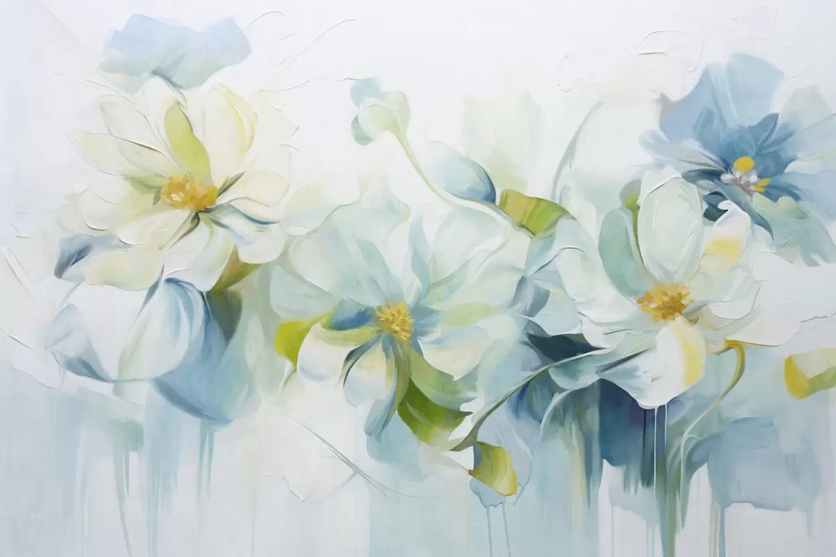 Murais de parede Flores abstratas brancas e azuis com pistilos amarelos e folhas verdes, em um fundo branco, estilo de pintura texturizada Nr. w09372